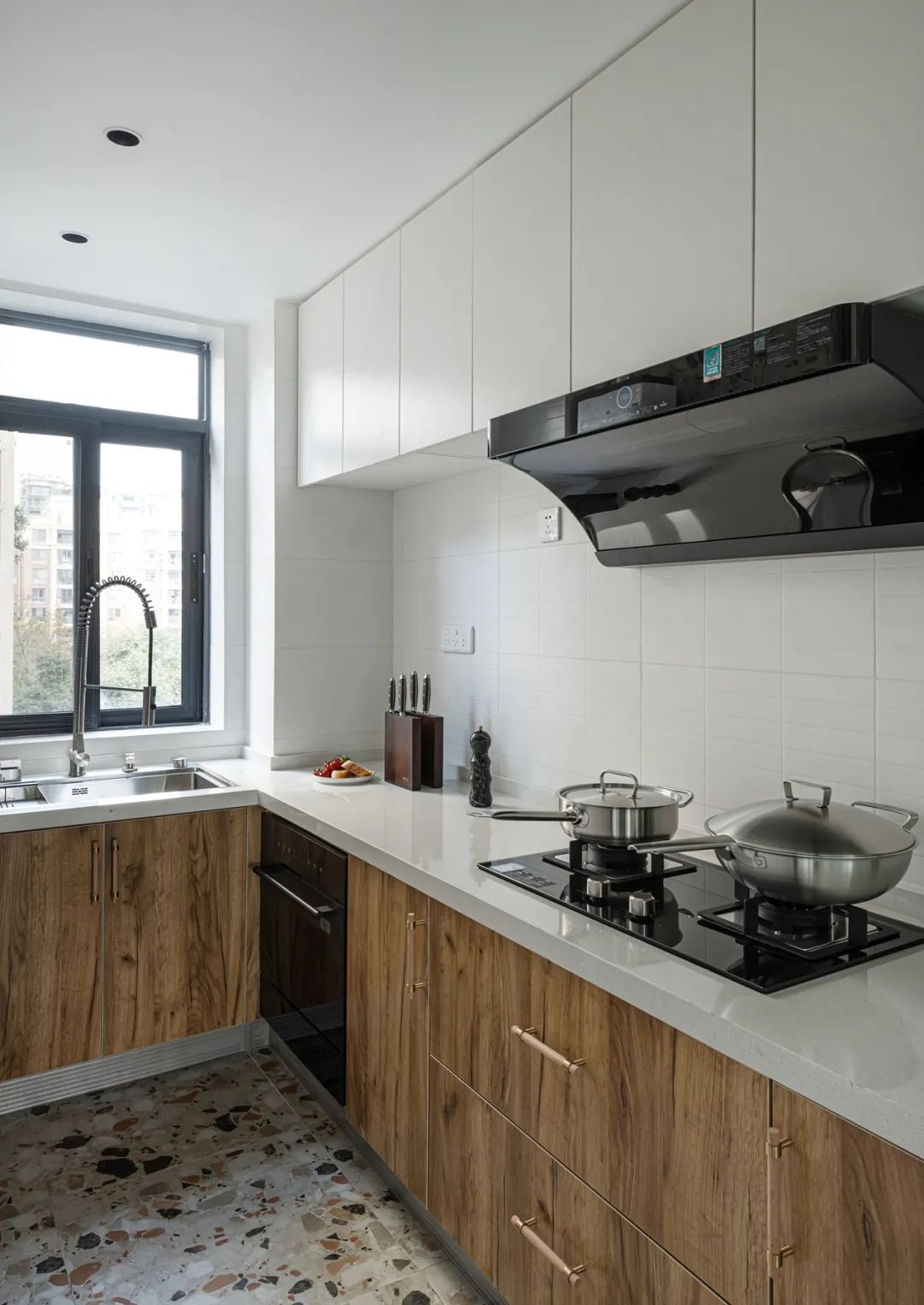 廚房空間寬裕,往里推860mm,留出獨立空間給冰箱,用移門分隔