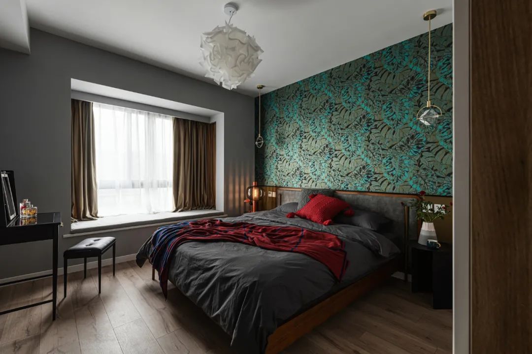 主臥運用藍綠斑駁的植物圖案墻紙與小蒼蘭黃乳膠漆進行背景墻分色,再搭配胭脂紅床品,形成鮮明對比,突出浪漫而復古的感覺。