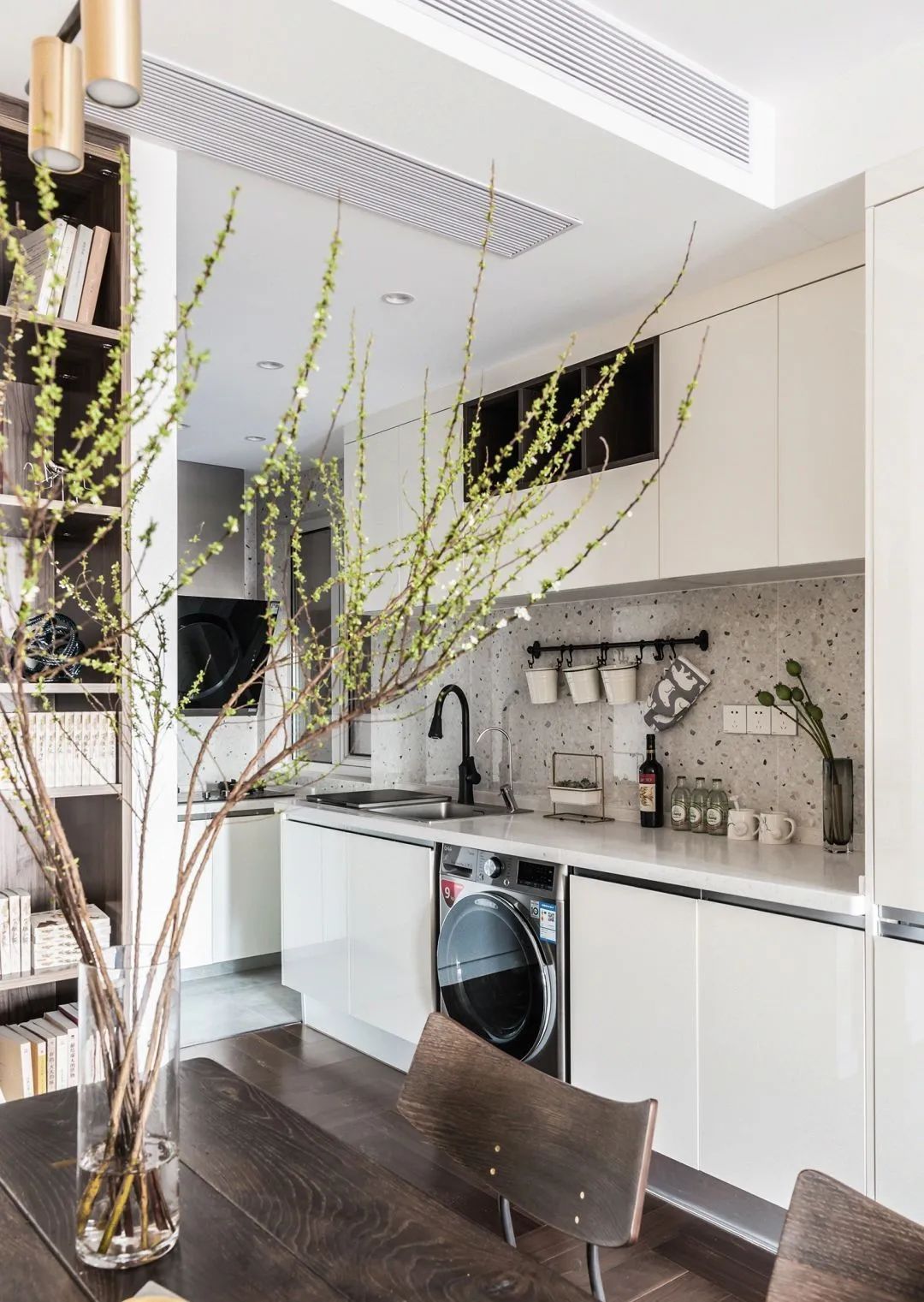 水槽旁邊設(shè)計了三排插座,解決廚房電器的電源需求,而洗碗機和洗衣機都做了嵌入式設(shè)計,放進西廚下方的柜子里,節(jié)省空間、方便使用。