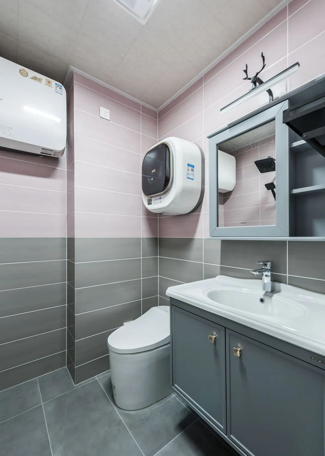 茱萸粉墻面搭配灰色地磚,低飽和度撞色,讓整個空間顯得優(yōu)雅低調(diào)。鏡柜收納日常洗漱用品,旁邊是坐便+壁掛洗衣機,規(guī)劃合理方便使用。