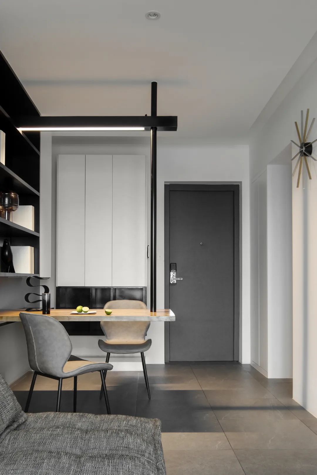 空間有對比才有層次,從過道看向客廳,餐廳的那一縷暖光剛剛好。