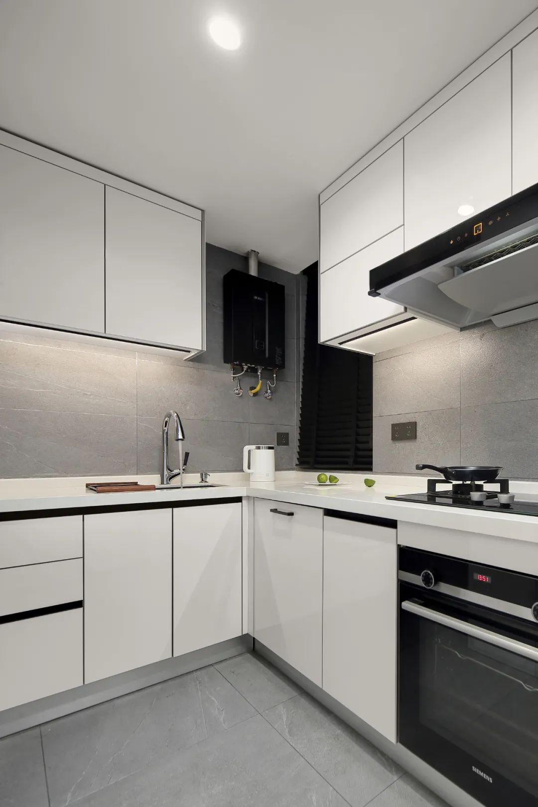 L型櫥柜,簡潔實(shí)用,適合小戶型,吊柜底部嵌入燈帶,避免做飯時(shí)背光。