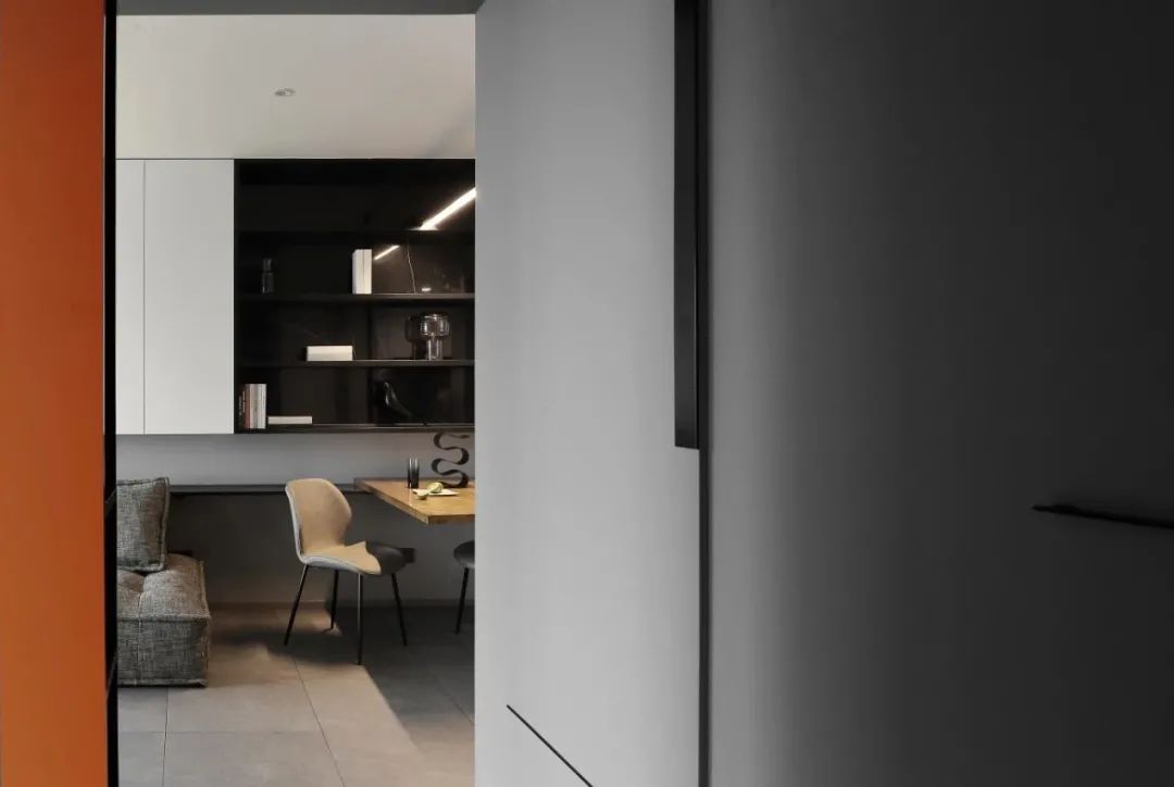 主臥,以大面積的灰色塊為基調(diào),搭配黑色家具,增加空間的厚重感,窗簾局部加入橘色點(diǎn)綴,打破黑白灰的清冷。
