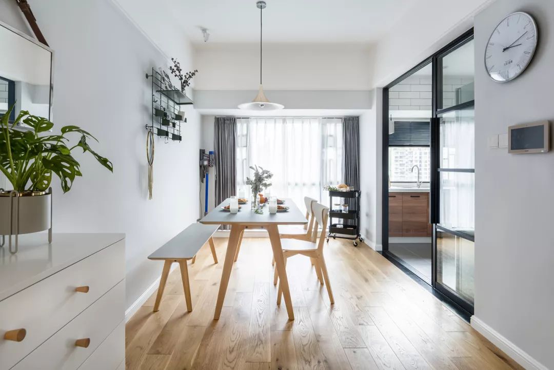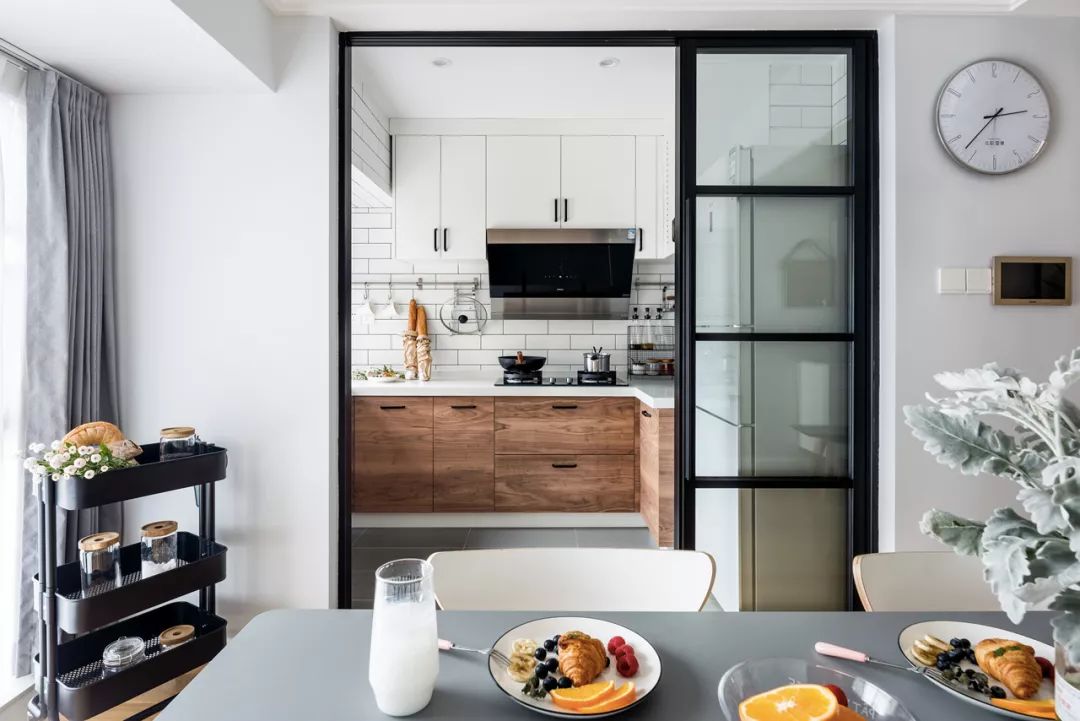玻璃推拉門,增加廚房與餐廳的互動性。推拉門也更加節省空間。