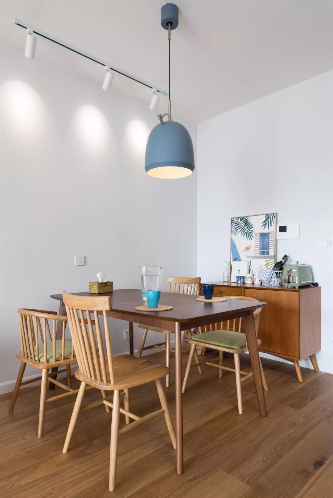 餐廳選用黑胡桃木餐桌+溫莎椅,自然舒適,天花采用一盞藍(lán)色的單頭吊燈+一排導(dǎo)軌射燈來照明,給餐廳帶來了些許活力。