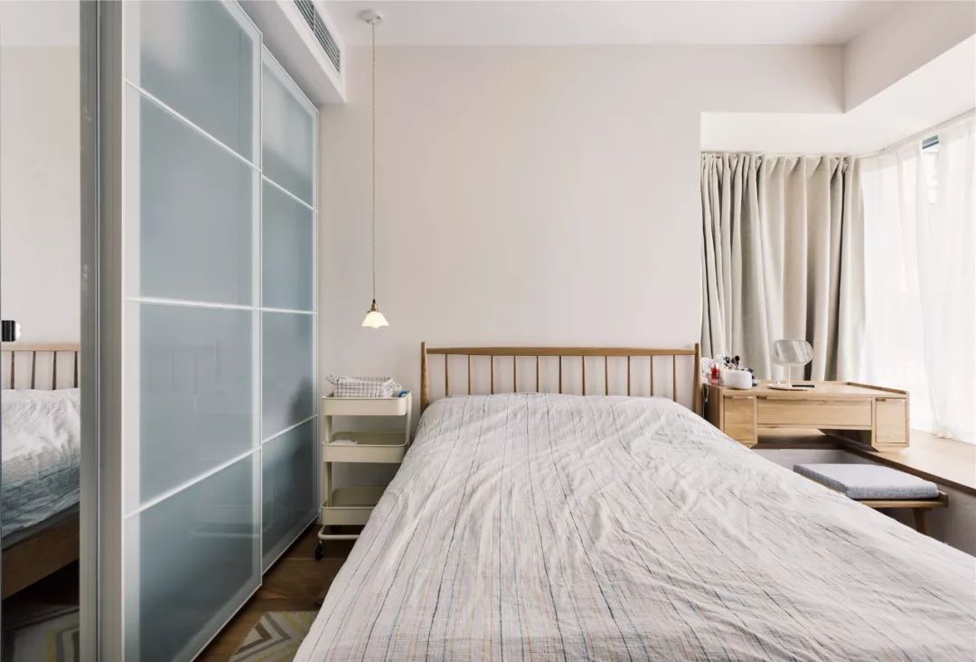 定制的衣柜,用玻璃推拉門+鏡柜門取代傳統(tǒng)的木質(zhì)柜門,在視覺上可以讓空間擴(kuò)大N倍,另外床頭的一邊是梳妝臺(tái),方便女主平時(shí)的梳妝打扮,另一邊則是宜家小推車,絕對是收納物品的“好幫手”。