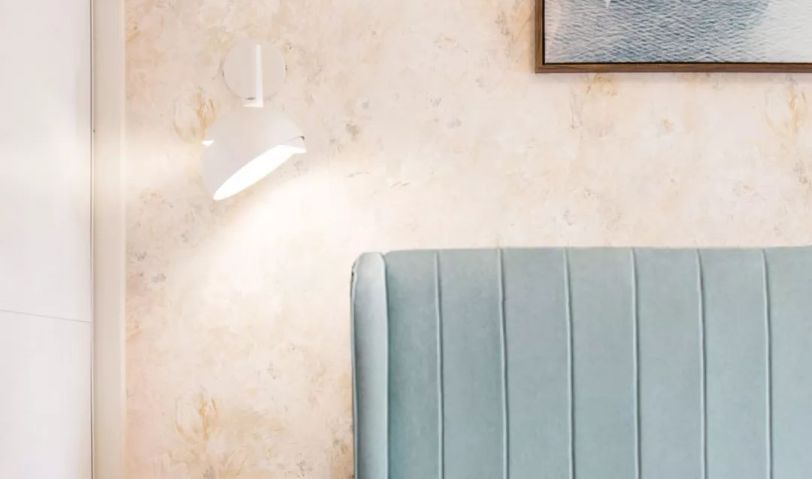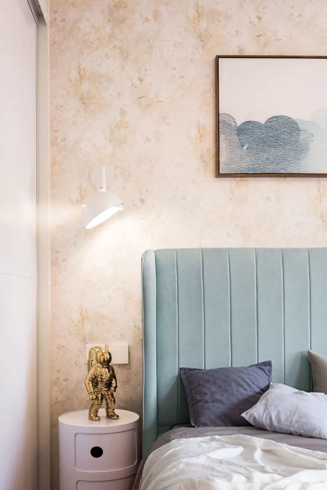 主臥馬卡龍藍(lán)色的床頭與客廳沙發(fā)背景色調(diào)相呼應(yīng),床頭與暖色系壁紙形成對比,溫暖的壁燈燈光,成為空間中最舒適的居心地。
