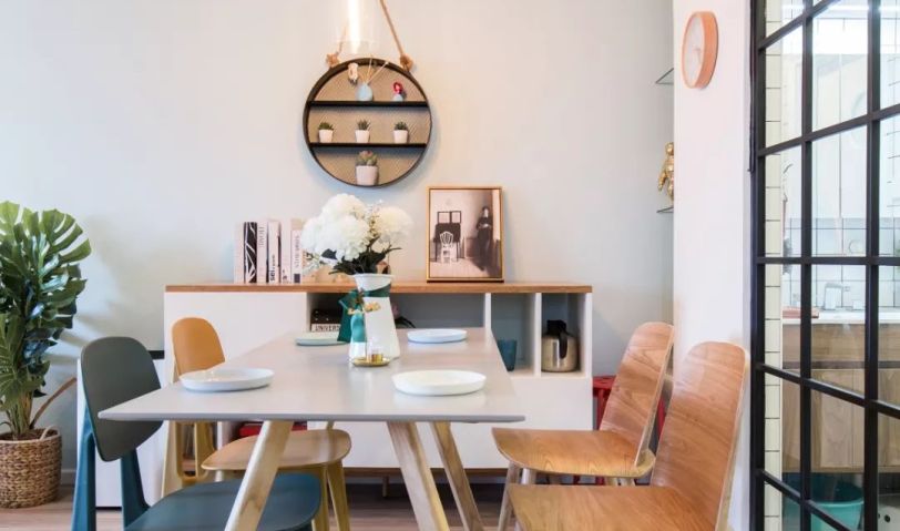 餐廳與衛(wèi)生間干區(qū)的分隔采用了黑色鐵藝玻璃隔斷,空間的采光與通透度都得到提高。