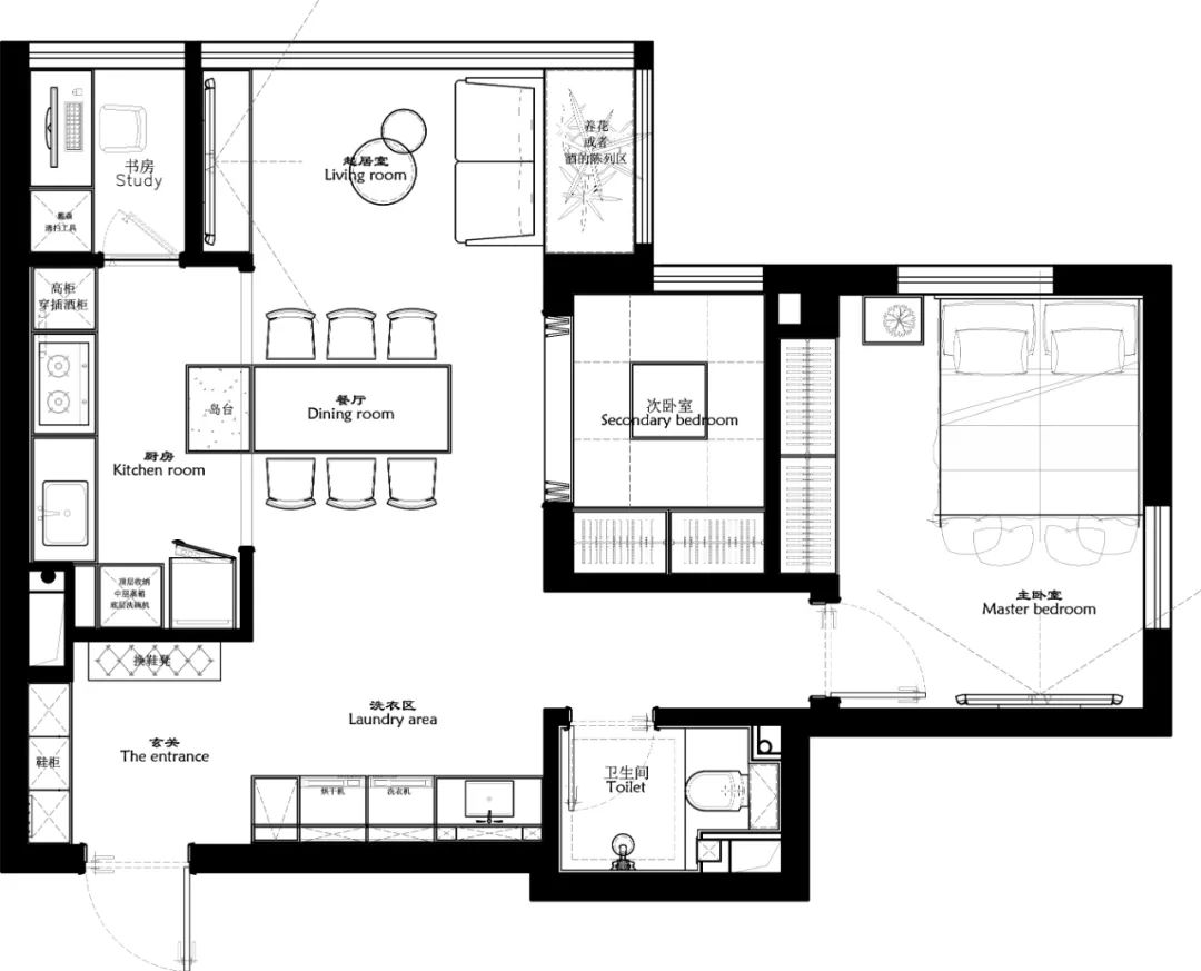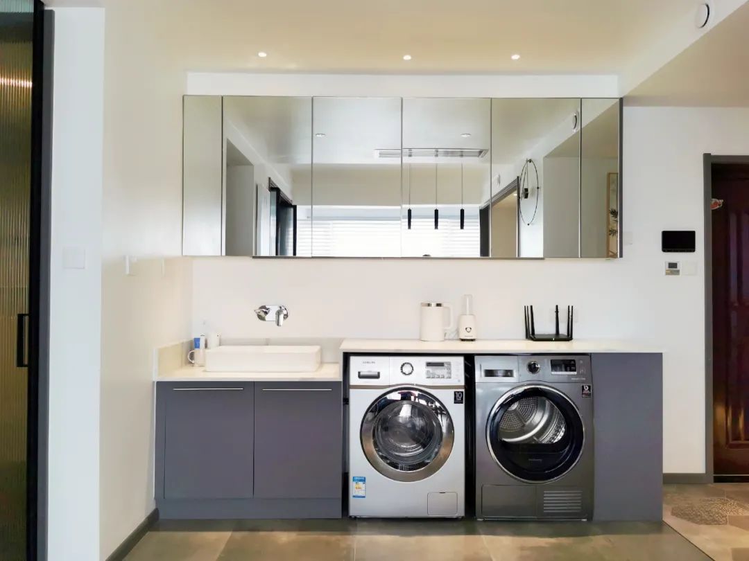 將原來的餐廳改造為衛(wèi)生間干區(qū),放置洗衣機(jī)、烘干機(jī)、洗手盆。