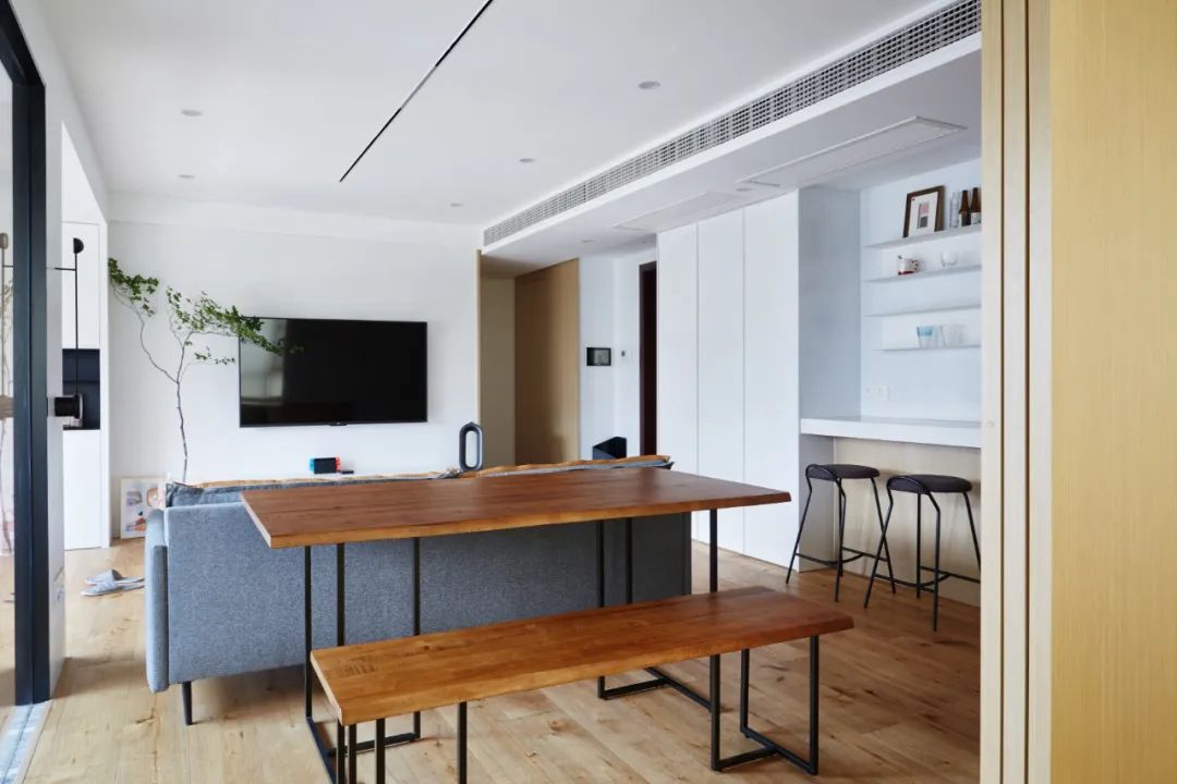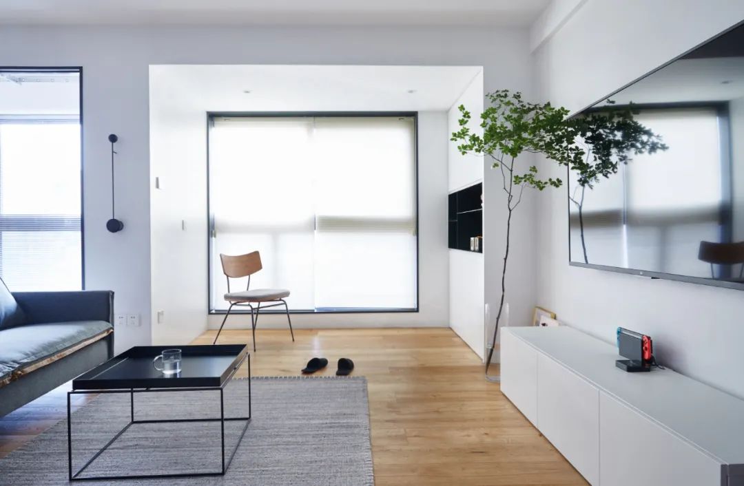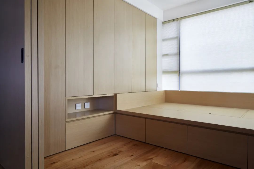 原木色榻榻米和整面的收納柜連為一體,簡潔至極,可用作客房,也增加了全屋收納。