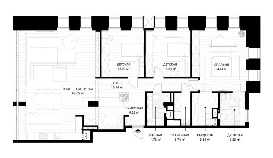 在公寓的私人部分有一個主臥室、一個更衣室和一個淋浴間、兩個兒童房、一個浴室和一個洗衣房的單一區(qū)域。