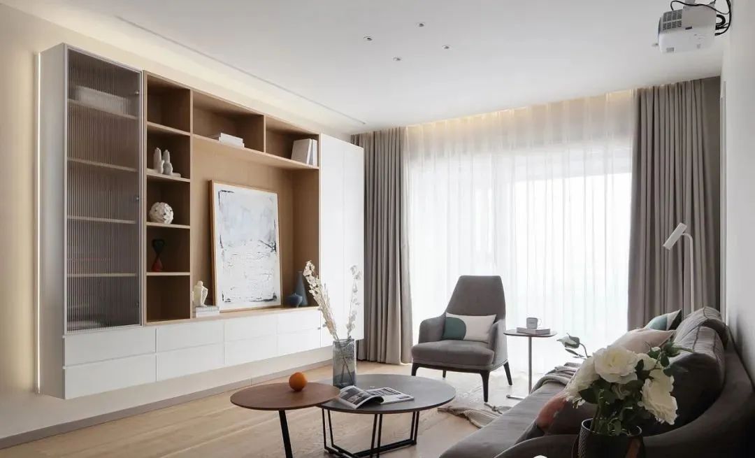客廳,沒有做傳統的電視背景墻,用了一個收納柜的形式,作為客廳的一個視覺點。投影幕布在吊頂前做了預埋,完美的融合在吊頂里。