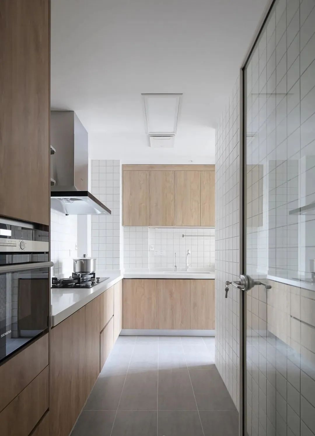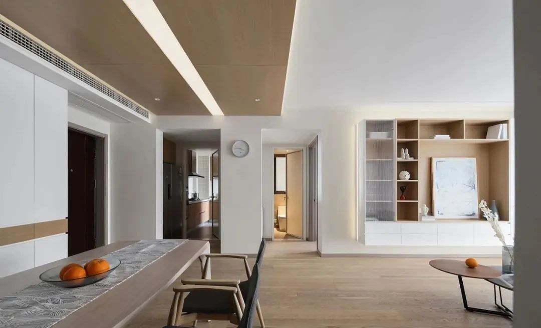 餐廳沒有用吊燈,而是用了頂面的平板燈,跟吊頂融為一體,讓整個空間更通透。頂面的木飾面,作為空間功能上的一種視覺分區。