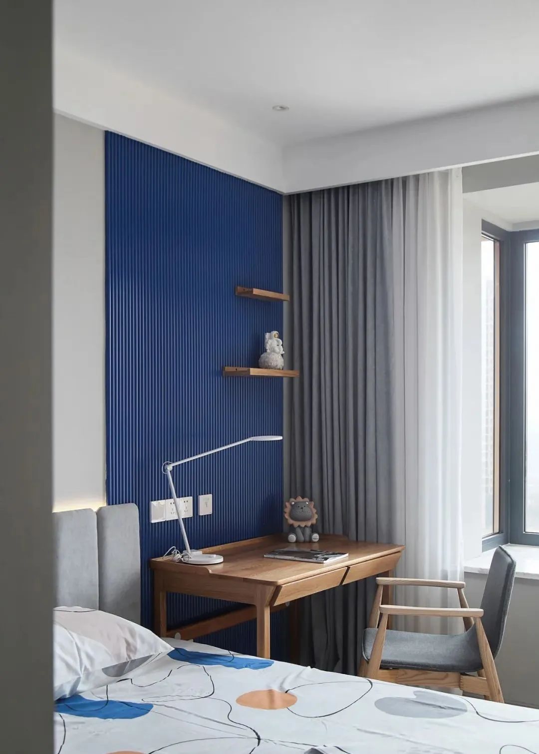 兒童房用了藍色的波浪板,給孩子的空間增加它獨特的一份氣質。床頭用了灰色的軟包。