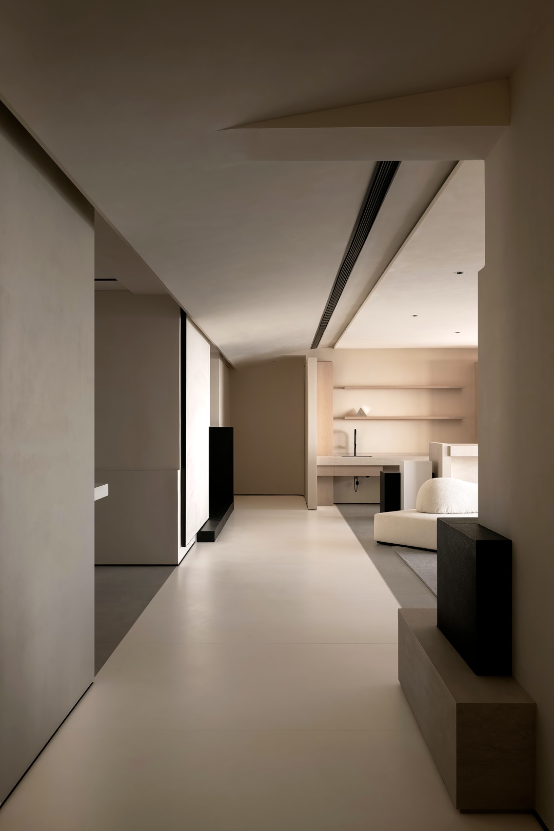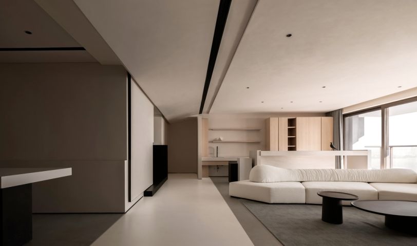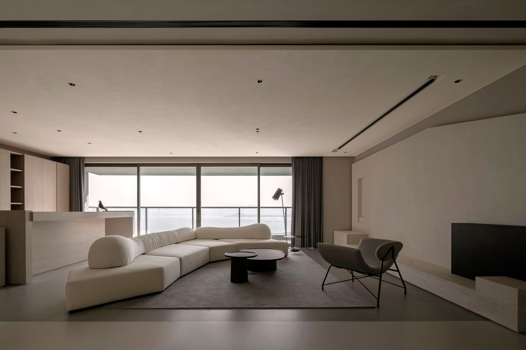 隨著視線的深入,墻面與天花一體的微水泥材質,顏色為設計師私人調配獨一無二的白,整個空間仿佛新生了第二層“皮膚”,自然低調。豐富的空間語言由多層次體塊構成,糅合了各種材質以達到視覺上的完美平衡。在陽臺眺望,眼前美景似乎有點恍惚,才想起要把視線轉回室內,回眸此處光景筑造的極簡居所。