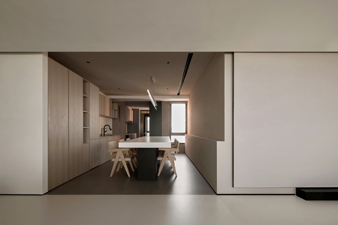 柔光迎著門扇的開啟漸漸慢反射而來,不經意的光線讓結構產生了陰影,層次感油然而生,讓細潤的圓與方正的棱角結構融合在了一起。黑色的門扇邊框凝聚了視覺焦點,與自然光譜寫空間,瞬間柔和通透。