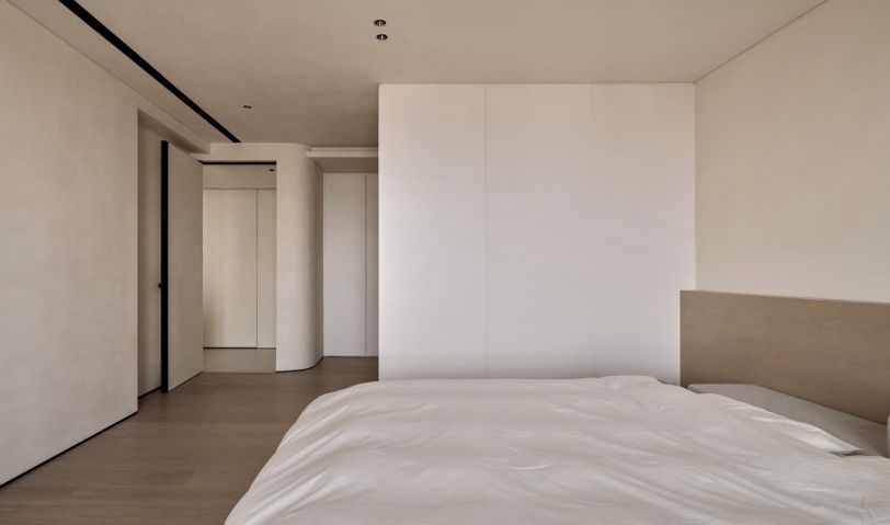 主臥是最能呈現出主人生活哲學的空間。除了必要的衣帽間、床、梳妝臺柜,臥室盡可能做減法,摒棄所有繁復冗雜的擺設。每當回到臥室,所有思緒回歸自我和返璞歸真。