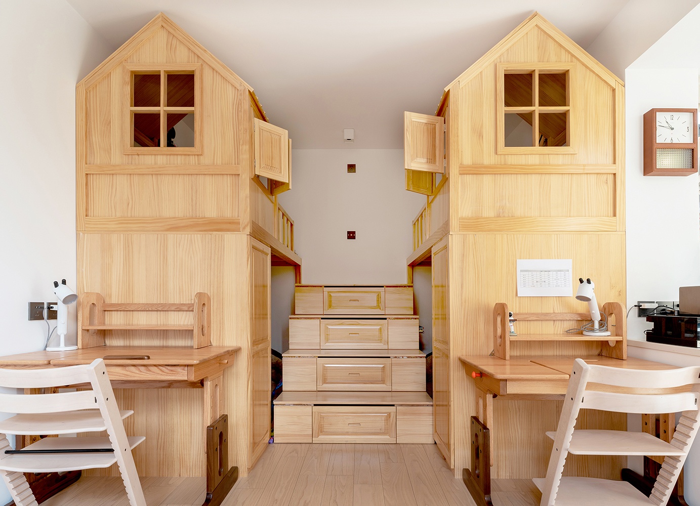 兒童房同時也是公共區域,考慮到有小孩,全屋定制都采用了實木定制。大面積的留白保證屋內的采光不受影響,讓小空間看起來更加干凈清爽。
