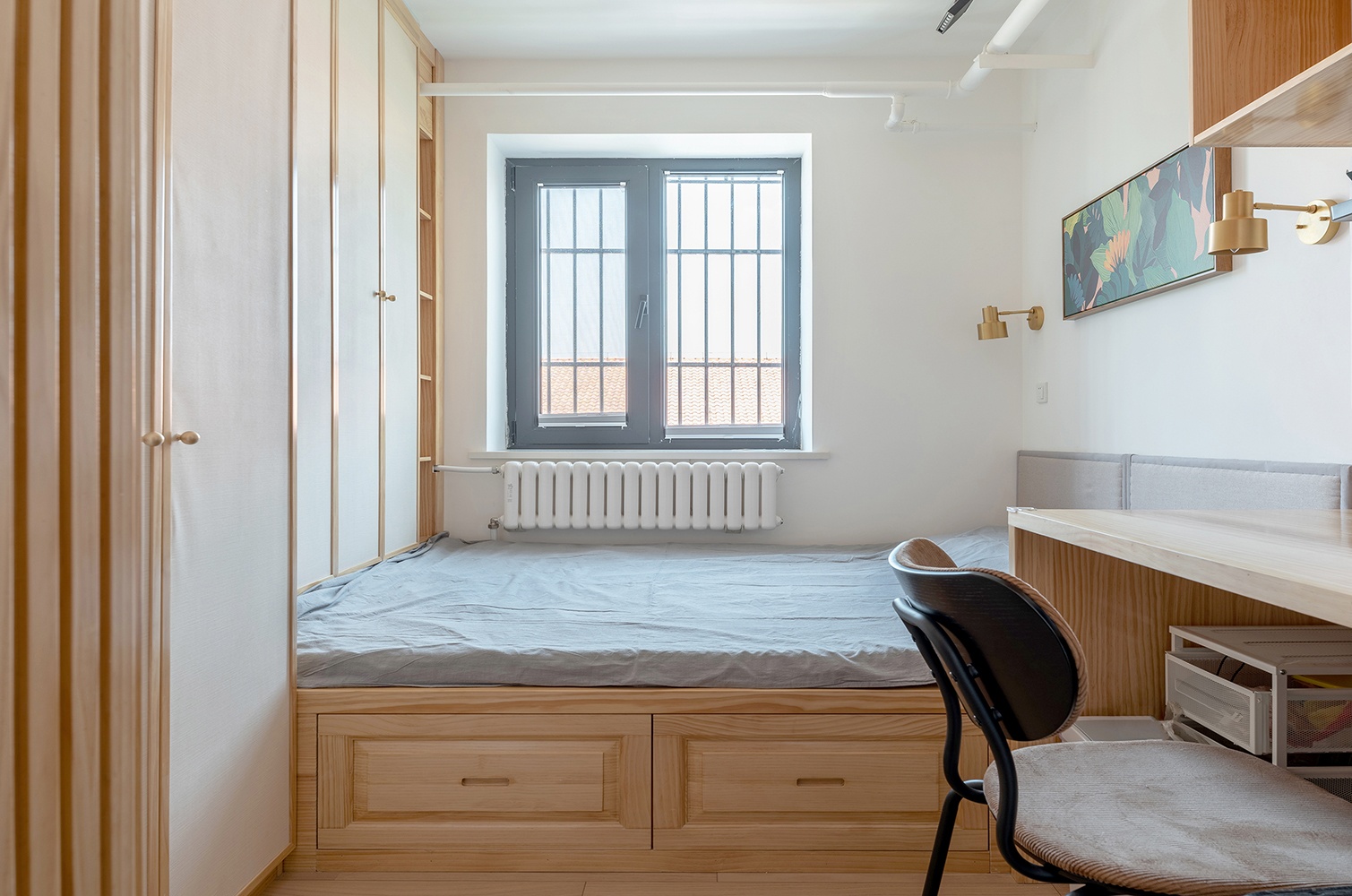 主臥定制榻榻米和儲物,充分的利用每一寸空間。男主人偶爾會有辦公的需求,增加了電腦桌。老房子管道比較多,直接將裸管進行刷漆處理,能夠很好的融入空間,不突兀即可。