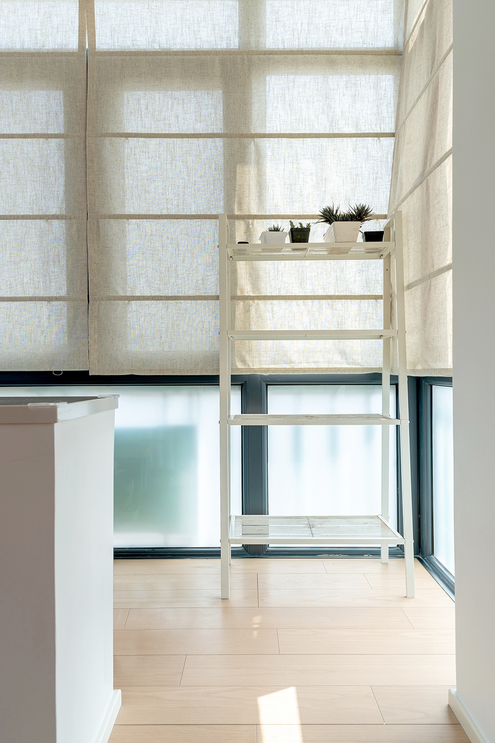 陽臺被一分為二,左邊區域有垛子作為晾曬區,衣服部分被遮擋減少雜亂。右邊則是女主精心照亮綠植的地方。實用+治愈兩不誤。