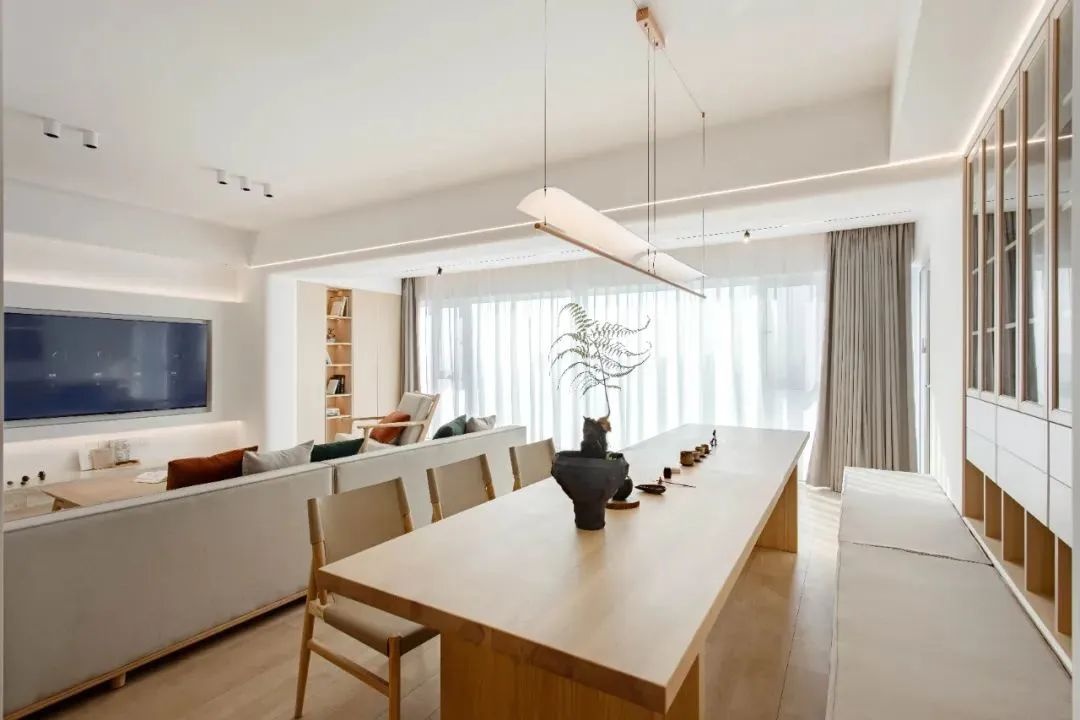 餐廳是一張超級大的長桌,兼顧餐桌和茶桌的功能,也是家人團(tuán)聚,交流,以及發(fā)展興趣的地方