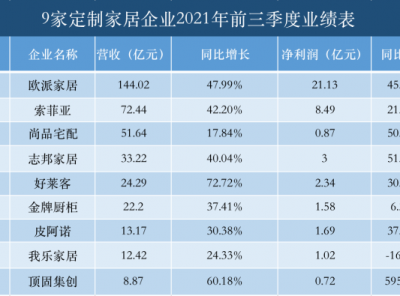 截至10月底,歐派、索菲亞、尚品宅配等9家上市定制家居企業(yè)的2021年第三季度報(bào)告都已公布。從整體上看,前三季他們業(yè)績都很不錯(cuò),營收、凈利潤 ...